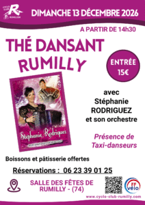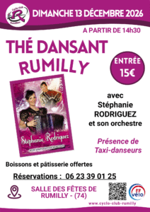 Dimanche 13 décembre 2026, le Cyclo-Club Rumillien vous invite à participer au Thé Dansant, animé par l’accordéoniste Stéphanie RODRIGUEZ et son orchestre